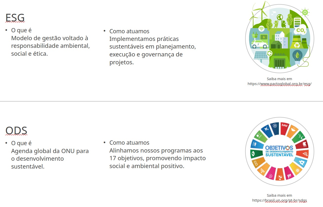 A FUNDAPS atua orientada pelos pilares ESG (Ambiental, Social e Governança) e pelos Objetivos de Desenvolvimento Sustentável (ODS). integrando boas práticas em todos os projetos e parcerias.